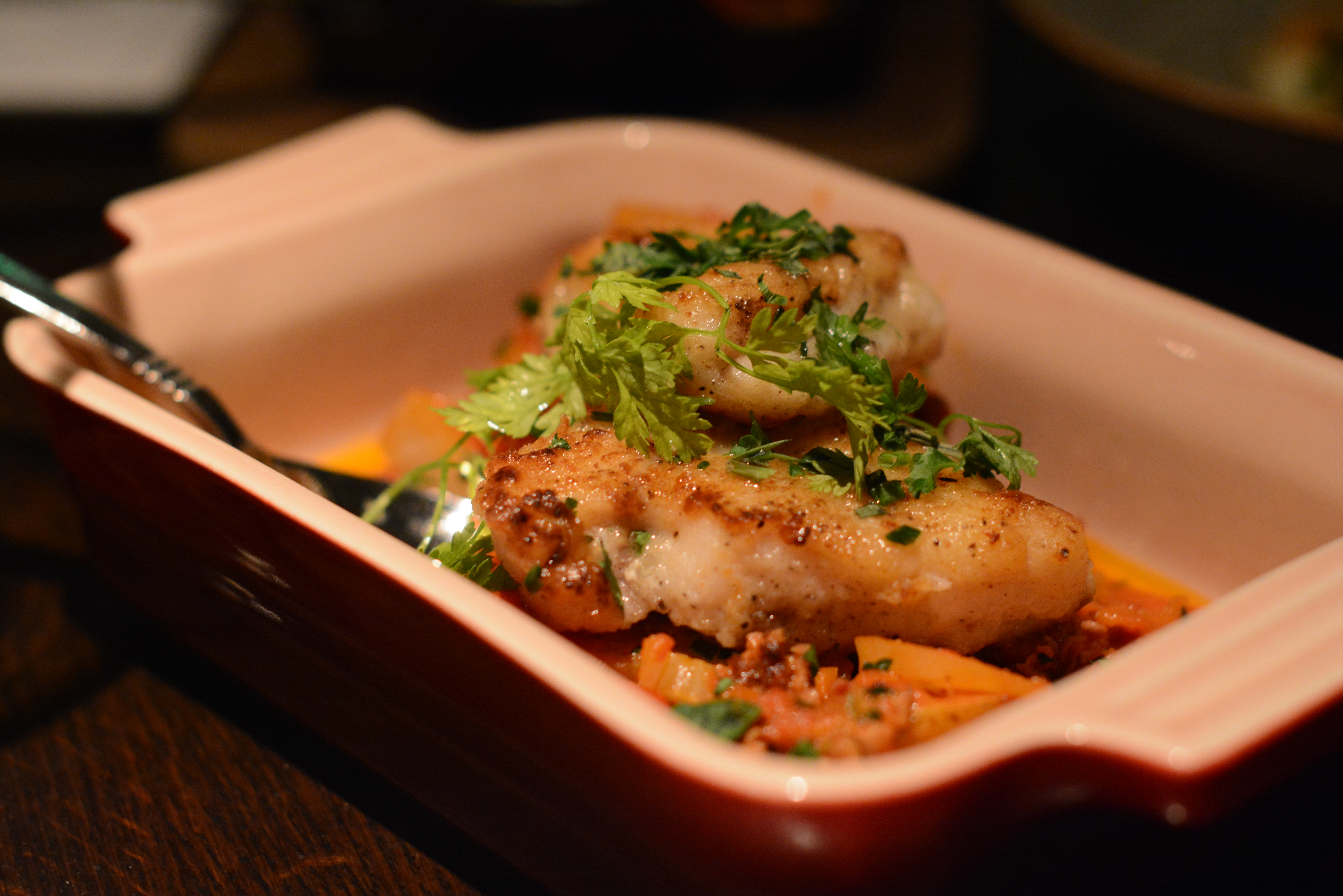 The Best Thing on the Menu: Monkfish with Merguez, Roasted Peppers and Fennel comes in Le Creuset-like serveware. This firm fish won’t win a beauty contest any time soon but it sure goes well with smokey meat. Typically monkfish is served with bacon or prosciutto, but at Urbana, Chef McKee uses gamey, sweet and spicy merguez sausage.