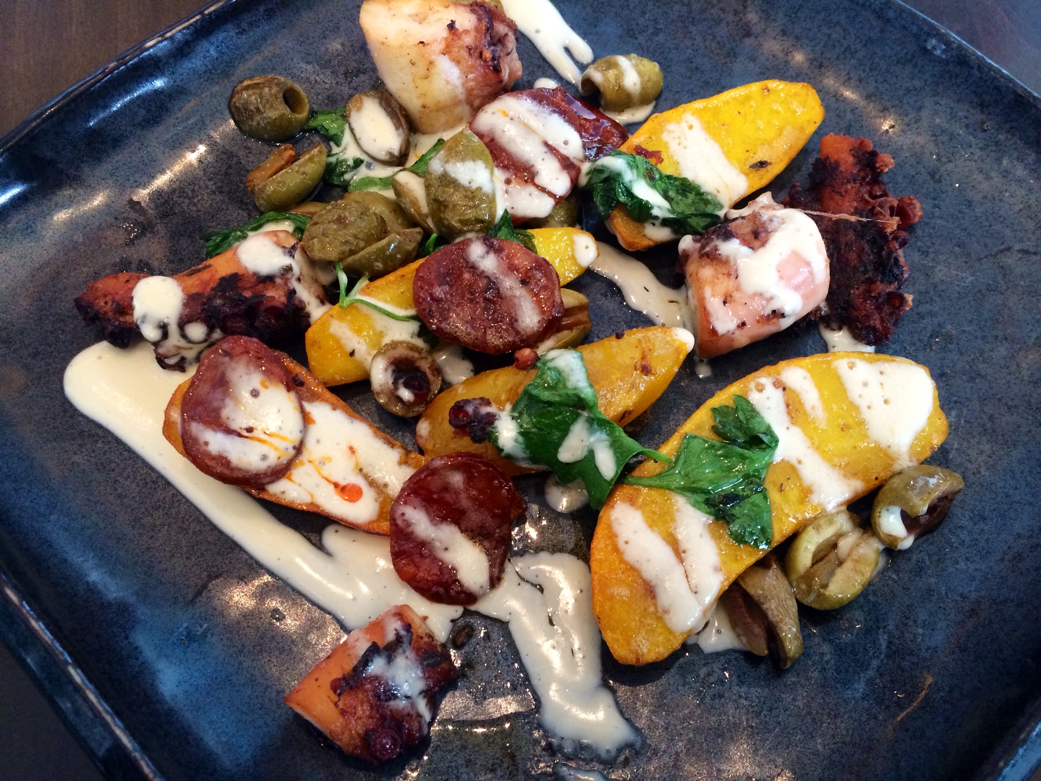 The adventurous should warm up to their lamb course by carbo loading first with charred chocolate rye bread and later with cavatelli dressed in octopus ragu. The rye comes with, SURPRISE, a whole sardine sunbathing on a bed of salt. He really announces his presence (unlike those Republican presidential hopefuls botched their debate entry). Break off fleshy fishy morsels and mount them on your rye bread for a bold bite that tastes like finding a Jewish deli in Greece.
